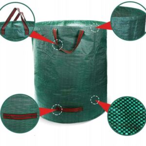 Vreča je opremljena s priročnimi ročaji, ki omogočajo enostavno prenašanje in praznjenje, kar vam prihrani čas in trud pri delu na vrtu.